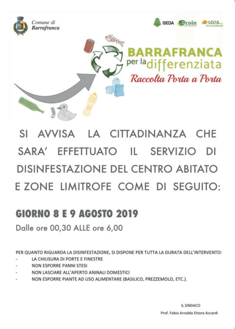 SI AVVISA LA CITTADINANZA CHE SARANNO EFFETTUATI I SERVIZI DI DERATTIZZAZIONE E DISINFESTAZIONE DEL CENTRO ABITATO E ZONE LIMITROFE COME DI SEGUITO: DERATTIZZAZIONE GIORNO 26 E 27 GIUGNO 2019 DISINFESTAZIONE GIORNO 3 E 4 LUGLIO 2019 DALLE ORE 00.30 ALLE ORE 06.00 PER QUANTO RIGUARDA LA DISINFESTAZIONE, SI DISPONE PER TUTTA LA DURATA DELL’INTERVENTO: – […]